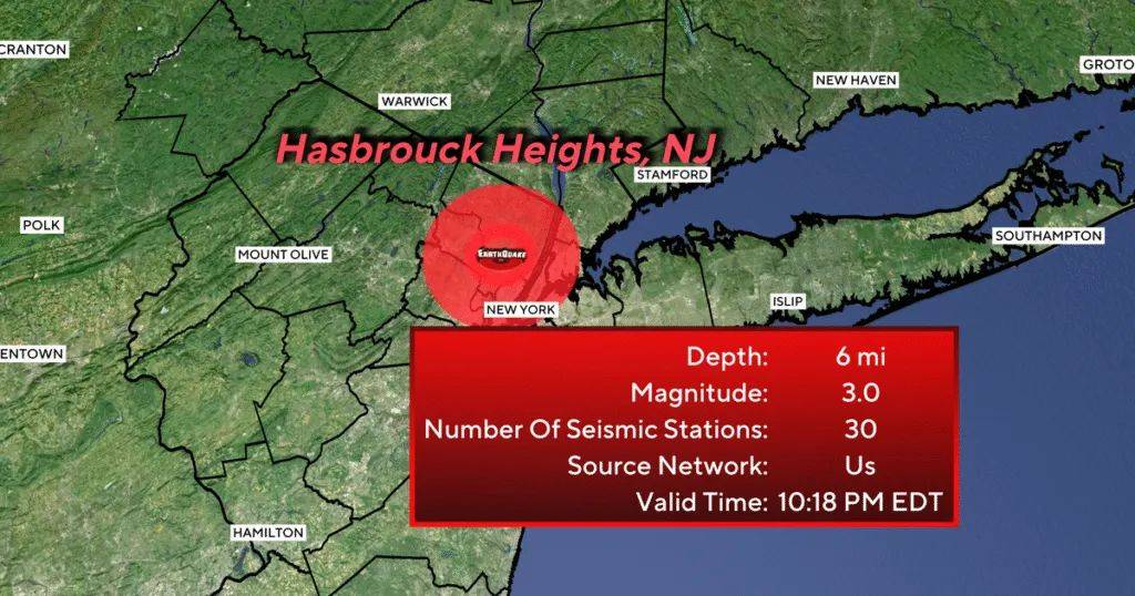 根据美国地质调查局(USGS)发布的信息,周六晚的地震震中位于新泽西州Hasbrouck Heights,距离曼哈顿仅十几公里,震级为3.0级,震源深度约10公里。