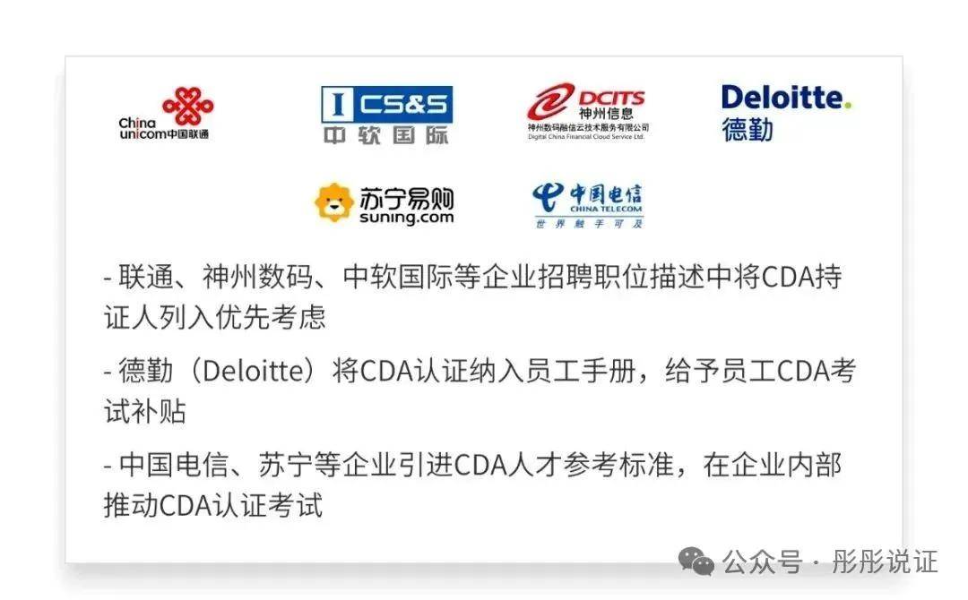 CDA企业认可度非常高,很多企业招聘时注明CDA数据分析师优先,对找工作非常有帮助。很多银行、金融机构的技术岗会要求必须是CDA数据分析师二级以上的持证人。中国联通、央视广信、德勤、苏宁等企业,把CDA持证人列入优先考虑或者对员工的CDA考试给补贴。