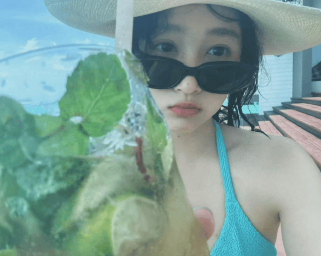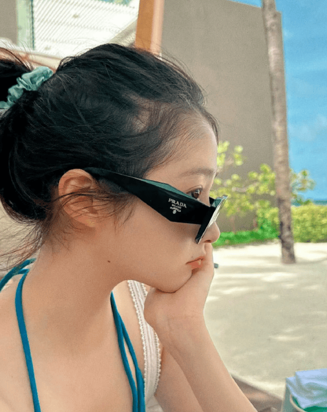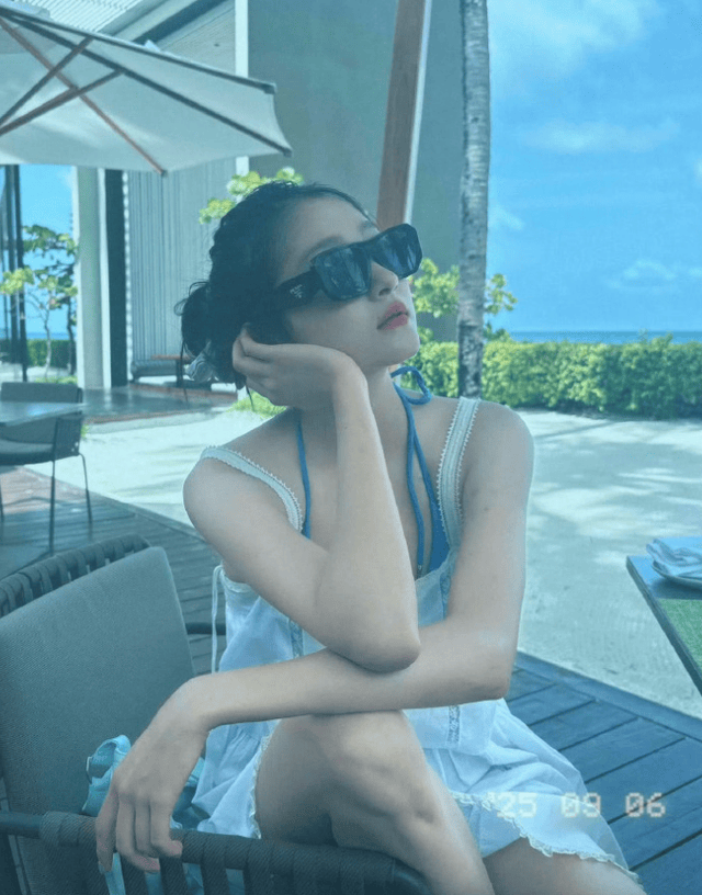 碧海蓝天下,关晓彤身着蓝黑相间的比基尼,头戴编织草帽,一副复古墨镜架在高挺的鼻梁上。微卷的秀发在海风中轻轻飘动,与往日标志性的黑长直造型形成鲜明对比。镜头里的她或慵懒地倚在泳池边,阳光在水面折射出细碎的光斑;或惬意地躺在白色躺椅上,一袭简约白裙与蔚蓝海景相得益彰。